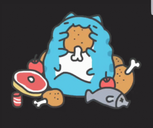 Paglalarawan ng Content: a cartoon drawing of a cat surrounded by food including meat