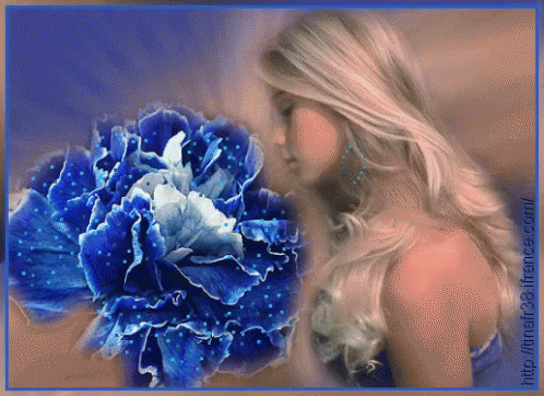 Paglalarawan ng Content: a woman in a blue dress is holding a large blue flower in front of her face