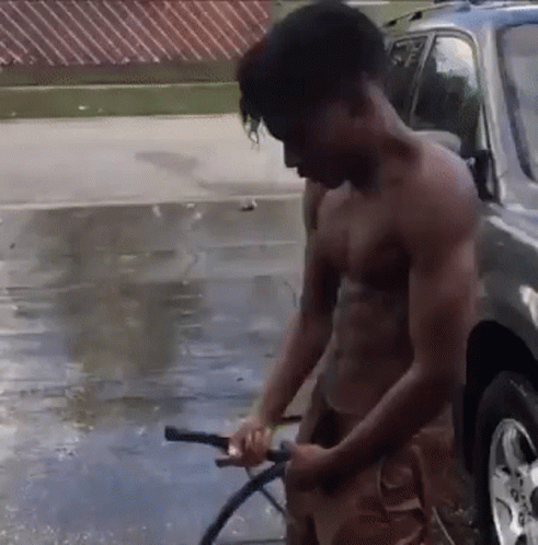 Paglalarawan ng Content: a shirtless man is washing a car in a driveway