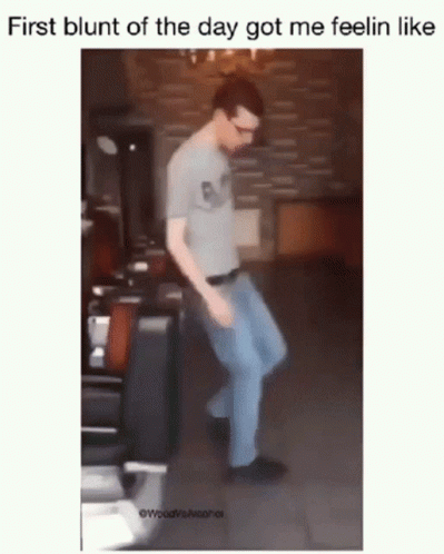 - Paglalarawan ng Content: a man is dancing in a room with the words `` first blunt of the day got me feelin like '' above him .