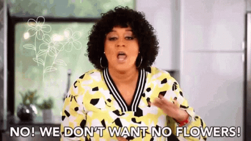 Paglalarawan ng Content: a woman in a yellow and black shirt is saying no we don 't want no flowers .
