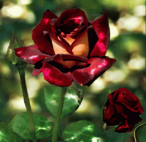 Paglalarawan ng Content: a red rose with a yellow center is surrounded by greenery