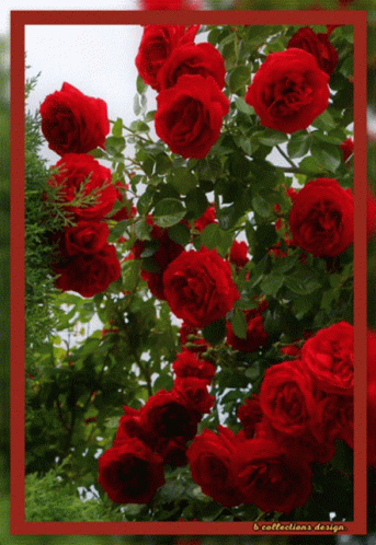 Paglalarawan ng Content: a bunch of red roses on a bush with a red frame
