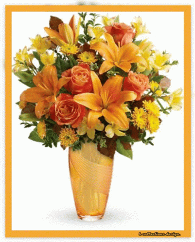 Paglalarawan ng Content: a vase filled with orange and yellow flowers has a yellow border