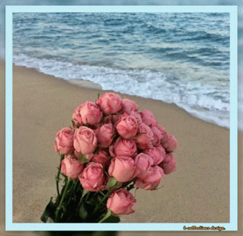 Paglalarawan ng Content: a bouquet of pink roses sits on a sandy beach with the ocean in the background