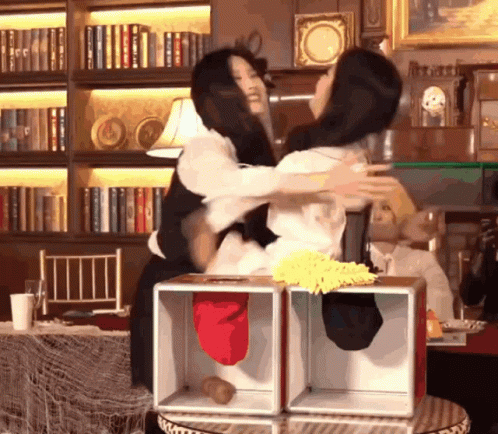 Paglalarawan ng Content: two women hugging each other in front of a bookcase