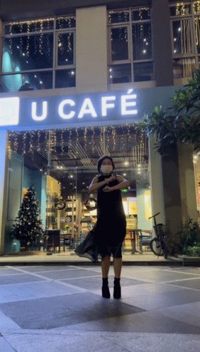 Paglalarawan ng Content: a woman in a mask stands in front of a sign that says u cafe
