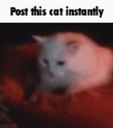 Paglalarawan ng Content: a white cat is sitting on a red blanket with the words `` post this cat instantly '' written above it .