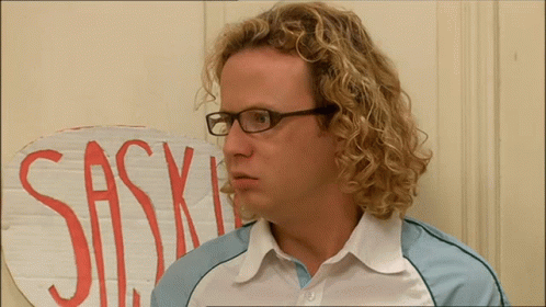 Paglalarawan ng Content: a man with curly hair and glasses stands in front of a sign that says sas