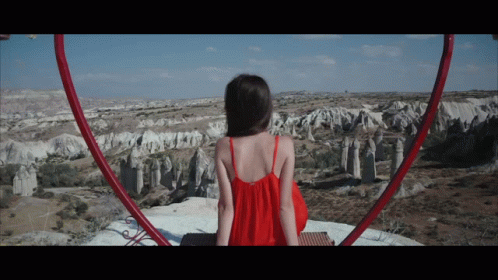 Paglalarawan ng Content: a woman in a red dress sits in a heart shaped frame overlooking a canyon