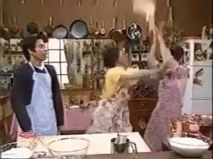 Paglalarawan ng Content: a man in an apron is standing in a kitchen with two women fighting .