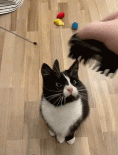 Paglalarawan ng Content: a black and white cat is being brushed on a wooden floor .