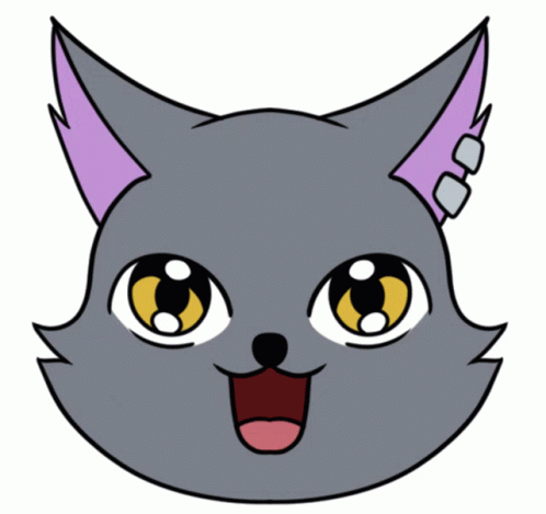 Paglalarawan ng Content: a cartoon drawing of a gray cat with purple ears and yellow eyes