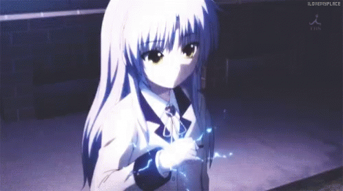 Paglalarawan ng Content: a girl with white hair and blue eyes is holding a lightning bolt in her hands .