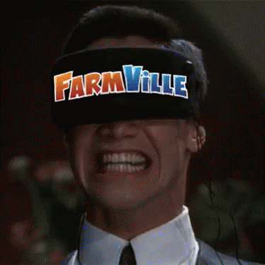 Paglalarawan ng Content: a man wearing a virtual reality headset with the word farmville on it