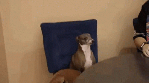 Paglalarawan ng Content: a dog is sitting on a chair next to a table .
