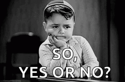 Paglalarawan ng Content: a little boy is sitting at a desk with his hand on his chin and the words `` so , yes or no ? '' .
