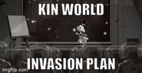 - Paglalarawan ng Content: a cartoon character is standing in front of a screen that says ' kin world invasion plan ' on it .