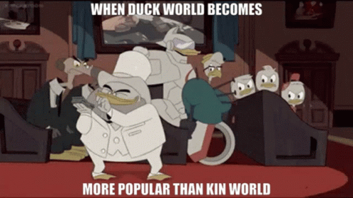 - Paglalarawan ng Content: a cartoon of a group of duck characters with a caption that says when duck world becomes more popular than kin world