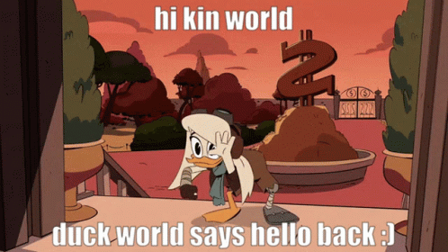 Paglalarawan ng Content: a cartoon of a duck says hi kin world and duck world says hello back