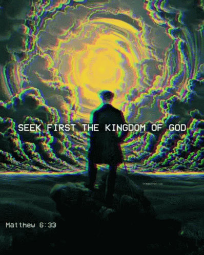 Paglalarawan ng Content: a painting of a man on a rock with the words seek first the kingdom of god