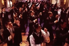 Paglalarawan ng Content: a large group of men in suits and bow ties are dancing in a room