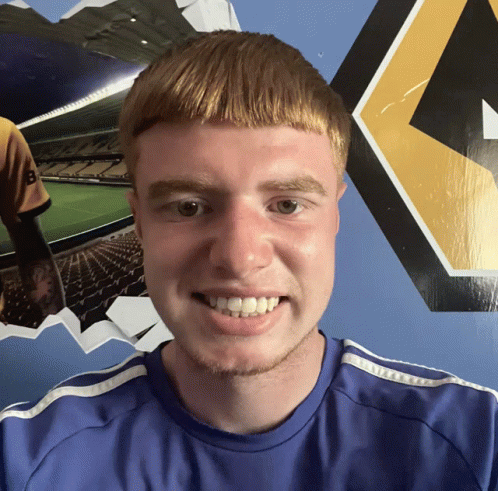 Paglalarawan ng Content: a young man wearing a blue shirt is smiling in front of a wall with a yellow arrow pointing to the right