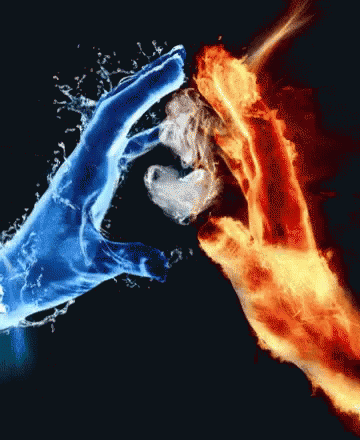 Paglalarawan ng Content: a hand made of water and a hand made of fire making a heart shape