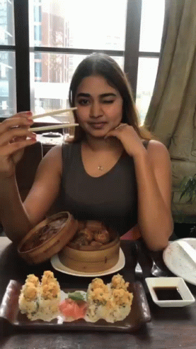 Paglalarawan ng Content: a woman sitting at a table eating dim sum