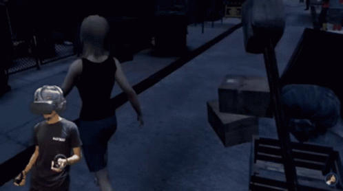 Paglalarawan ng Content: a man wearing a virtual reality headset is walking with a woman in a tank top