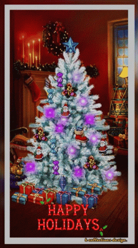 Paglalarawan ng Content: a christmas tree with purple decorations and the words happy holidays on the bottom