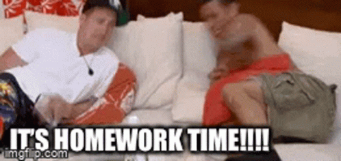 Paglalarawan ng Content: two men are sitting on a couch and one of them is saying `` it 's homework time !!! ''