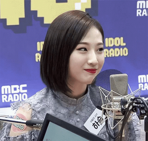 Paglalarawan ng Content: a woman is sitting in front of a microphone with a name tag that says idol radio on it