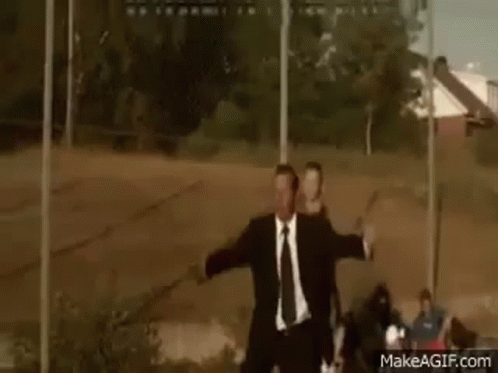 Paglalarawan ng Content: a man in a suit and tie is standing in front of a fence with his arms outstretched .