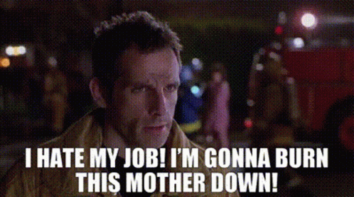 Paglalarawan ng Content: a man is saying `` i hate my job ! i 'm gonna burn this mother down '' .