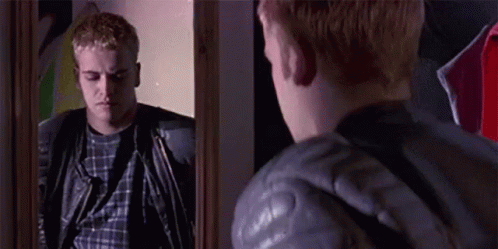 Paglalarawan ng Content: a young man is looking at himself in a mirror while holding a card .