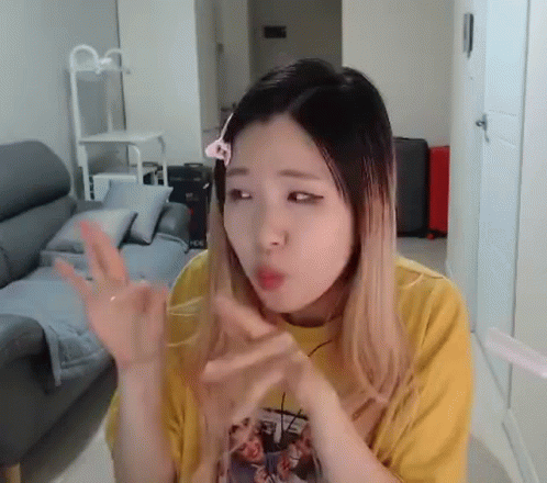 Paglalarawan ng Content: a woman in a yellow t-shirt is making a funny face in a living room .