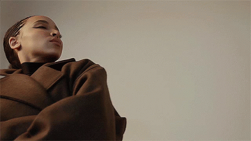 Paglalarawan ng Content: a woman in a brown coat and black turtleneck is looking up