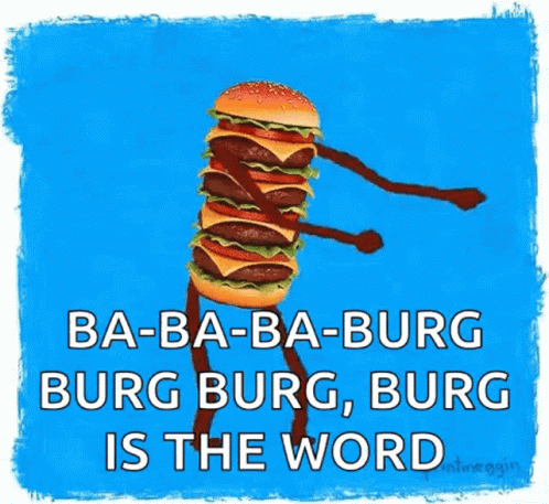 Paglalarawan ng Content: a cartoon illustration of a hamburger with arms and legs that says burg burg burg is the word