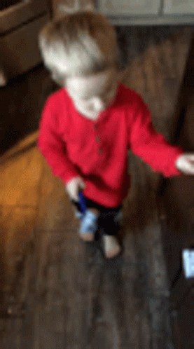 Paglalarawan ng Content: a young boy in a red sweater is standing on a wooden floor .