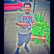 Paglalarawan ng Content: a boy wearing a shirt that says run big is running down the sidewalk