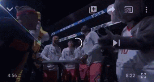 Paglalarawan ng Content: a group of people are standing around a table in a stadium with a mascot .