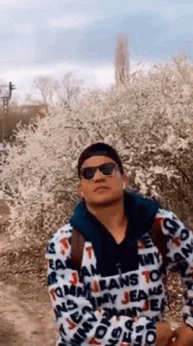 Paglalarawan ng Content: a man wearing sunglasses and a hat is standing in front of a tree with flowers .
