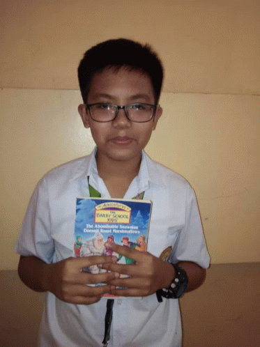 Paglalarawan ng Content: a boy in a white shirt holds a book titled the harley school kids