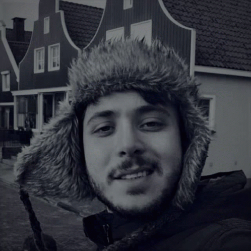 Paglalarawan ng Content: a man wearing a fur hat is smiling in front of a row of houses
