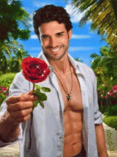 Paglalarawan ng Content: a shirtless man is holding a red rose in front of a blue sky and palm trees
