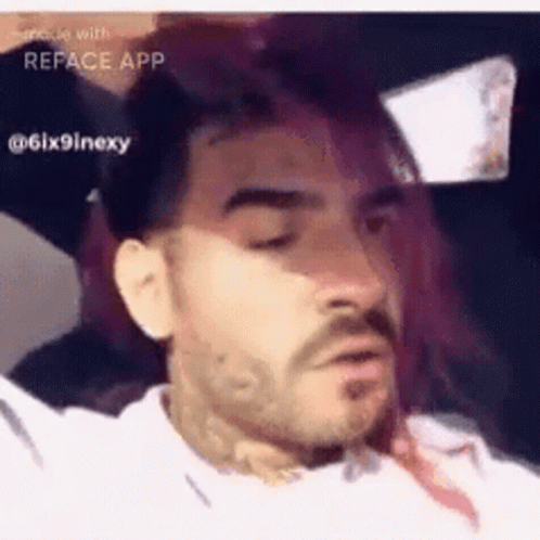 Paglalarawan ng Content: a man with a beard and purple hair is sitting in a car .