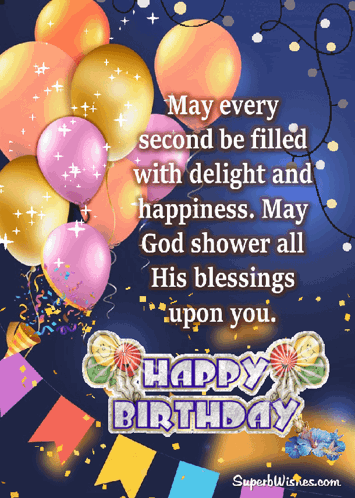 - Paglalarawan ng Content: a happy birthday card with balloons and confetti and the words may every second be filled with delight and happiness