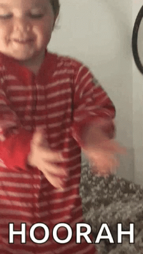 Paglalarawan ng Content: a little girl in a red and white striped shirt is dancing with the word hoorah written in white letters .