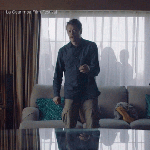 Paglalarawan ng Content: a man stands in front of a couch with la guarimba film festival written on the bottom right